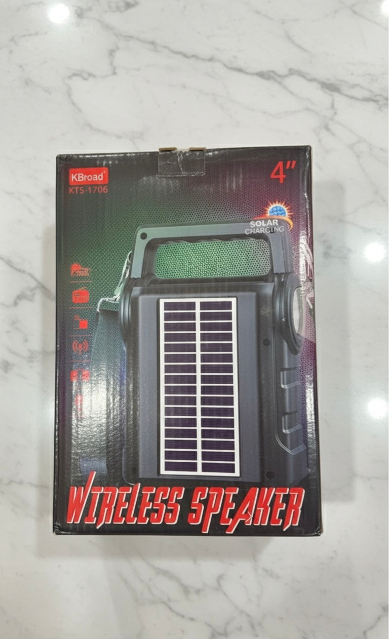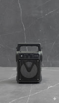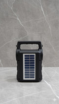 Portable Bluetooth speaker with solar charging, LED torch, FM radio, and multiple input modes. Ideal for outdoor and travel use.